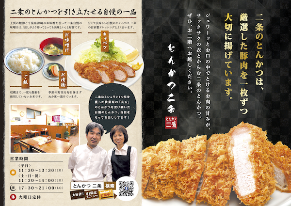 看板の内容は、おいしそうなとんかつの写真、とんかつ定食の脇役の解説、店内の雰囲気がわかるような写真、店主と奥さんの写真を入れました。