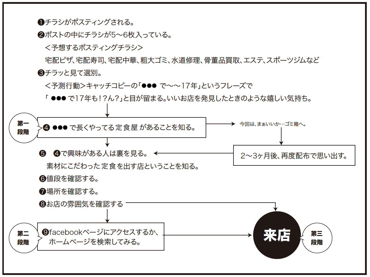 このチラシをポスティングされた人がお店に来るまでの行動にまで想像を広げてみました。